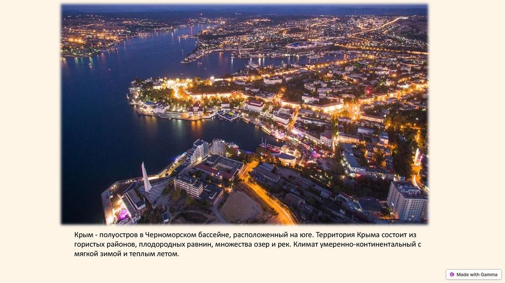 Крым - полуостров в Черноморском бассейне, расположенный на юге. Территория Крыма состоит изгористых районов, плодородных равнин, множества озер и рек. Климат умеренно-континентальный с