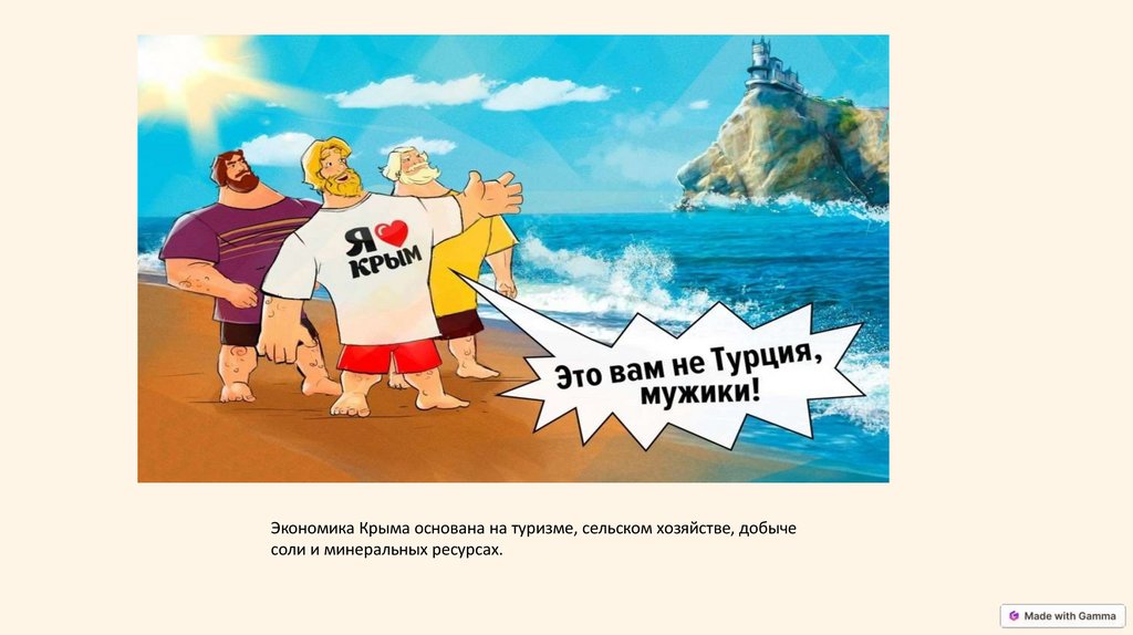 Экономика Крыма основана на туризме, сельском хозяйстве, добычесоли и минеральных ресурсах.