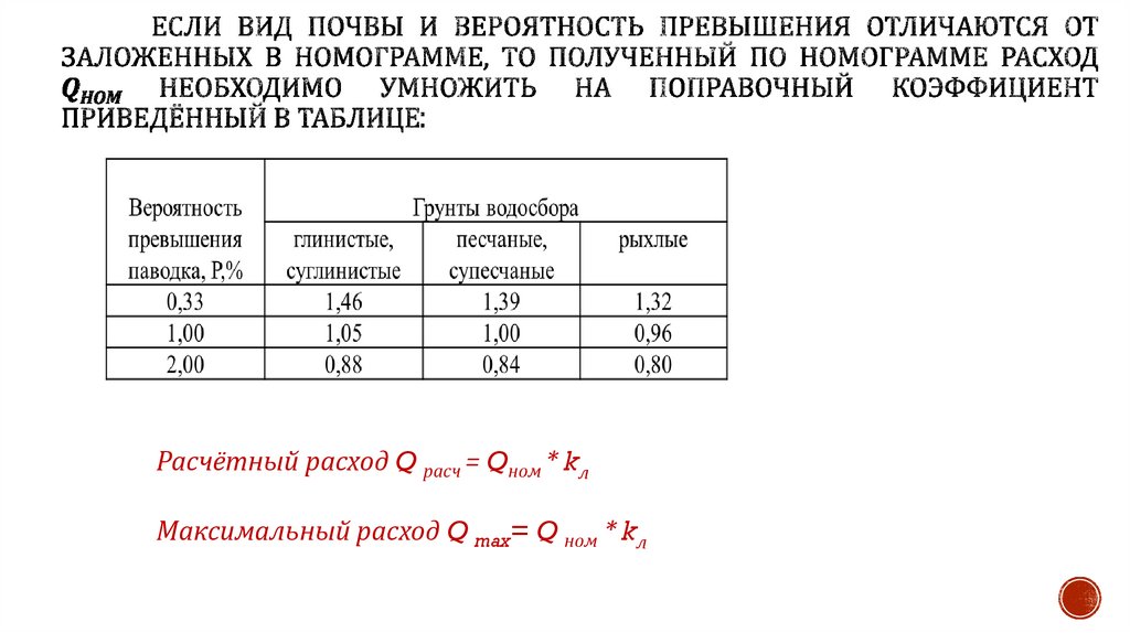 Расчётный расход Q расч = Qном * kлМаксимальный расход Q max= Q ном * kл