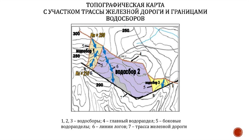 1, 2, 3 – водосборы; 4 – главный водораздел; 5 – боковыеводоразделы; 6 – линии логов; 7 – трасса железной дороги