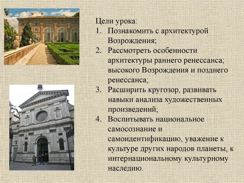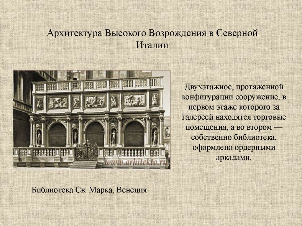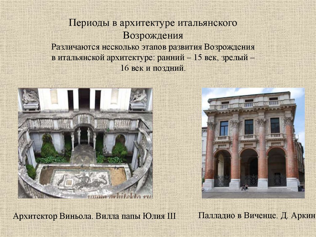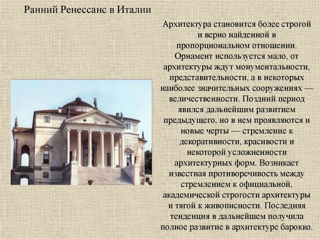в итальянской архитектуре: ранний – 15 век, зрелый –