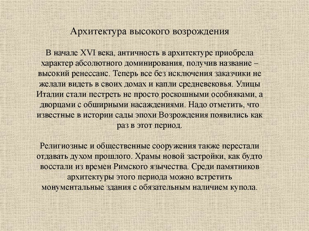 Архитектура высокого возрожденияВ начале XVI века, античность в архитектуре приобрела