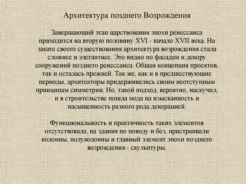 Архитектура позднего ВозрожденияЗавершающий этап царствования эпохи ренессанса