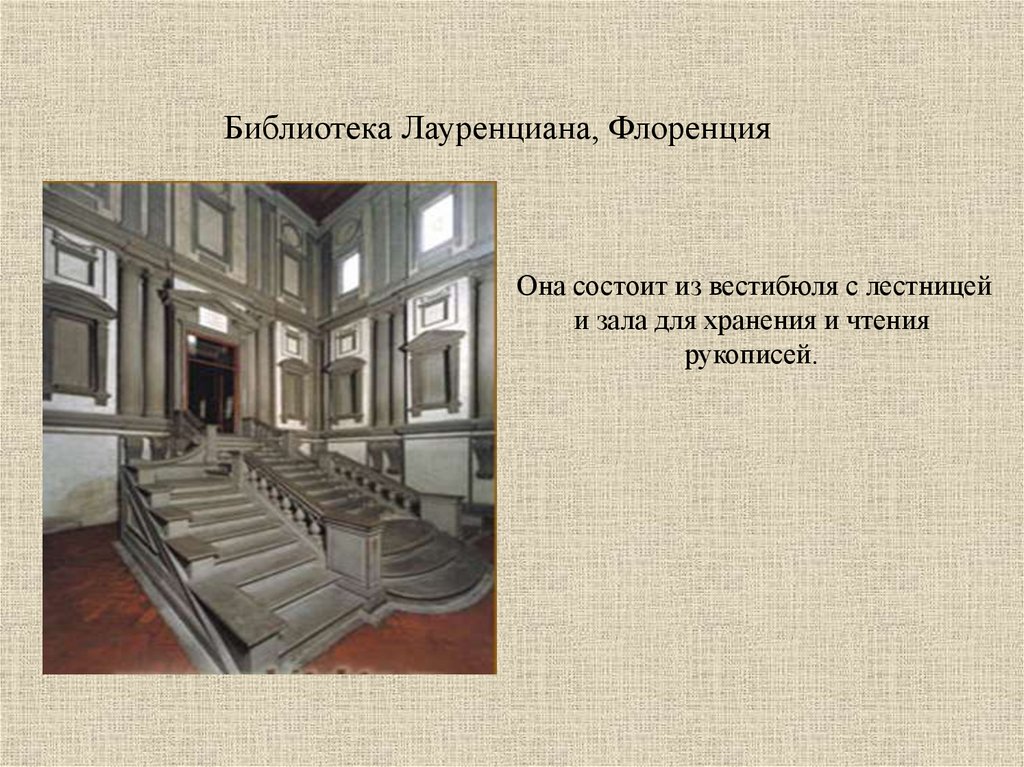 Библиотека Лауренциана, ФлоренцияОна состоит из вестибюля с лестницей