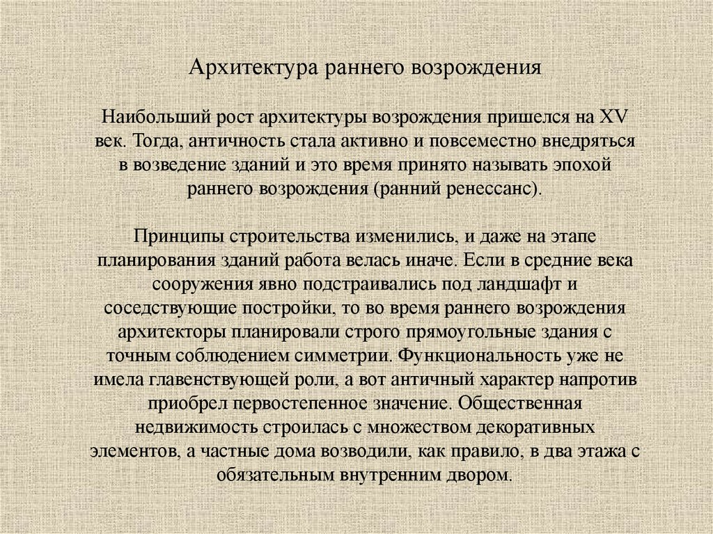 Архитектура раннего возрожденияНаибольший рост архитектуры возрождения пришелся на XV