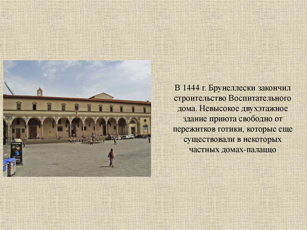 В 1444 г. Брунеллески закончилстроительство Воспитательного