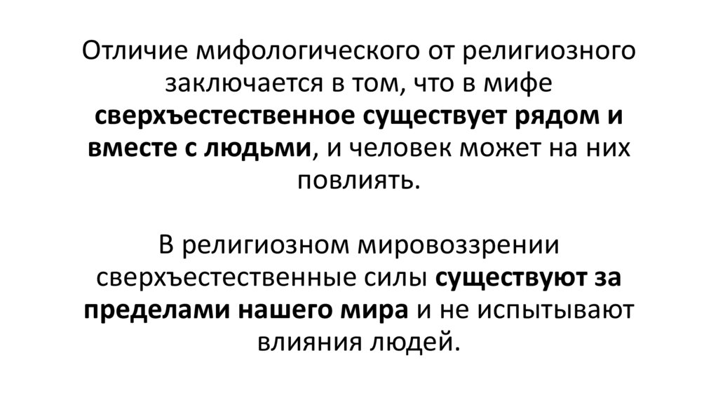 Отличие мифологического от религиозногозаключается в том, что в мифе