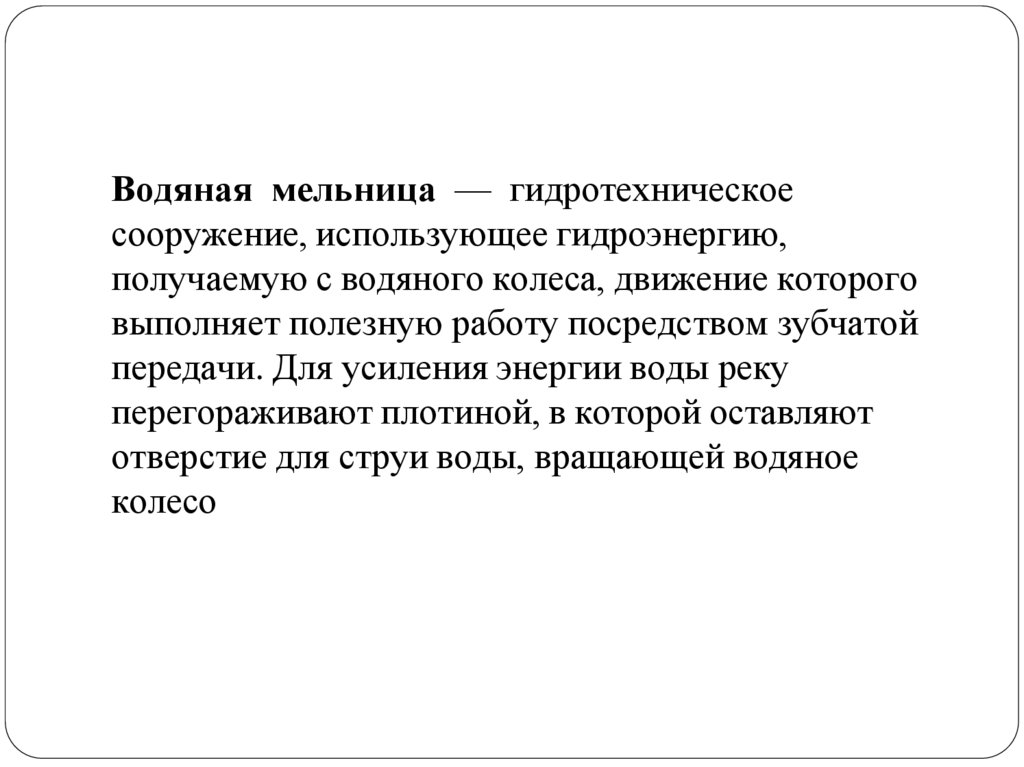 Водяная мельница — гидротехническоесооружение, использующее гидроэнергию,