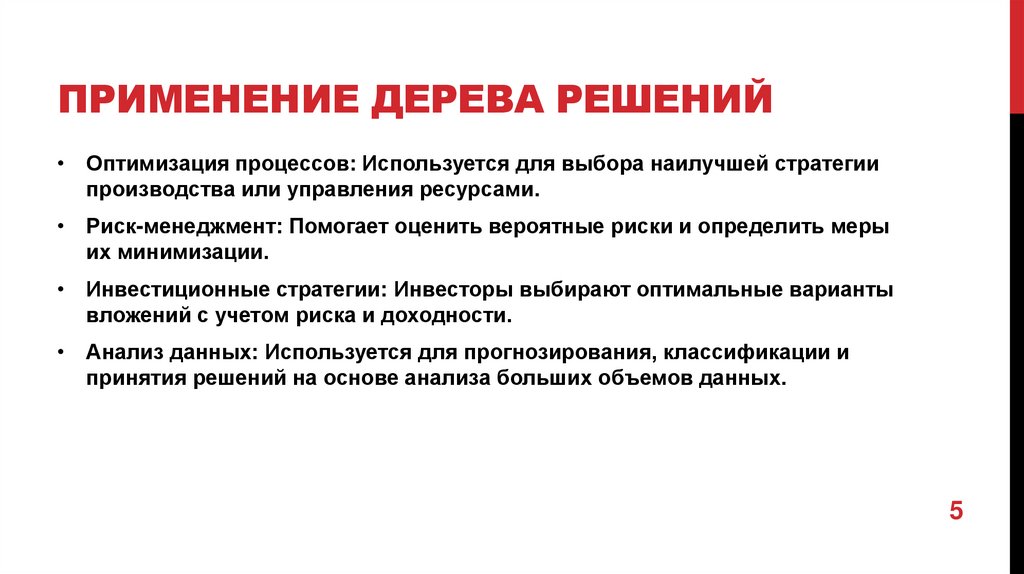 ПРИМЕНЕНИЕ ДЕРЕВА РЕШЕНИЙ• Оптимизация процессов: Используется для выбора наилучшей стратегии