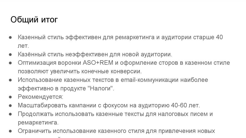 Общий итог● Казенный стиль эффективен для ремаркетинга и аудитории старше 40