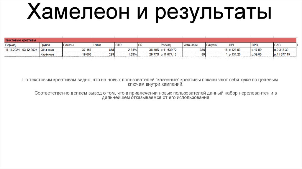 Хамелеон и результатыПо текстовым креативам видно, что на новых пользователей “казенные” креативы показывают себя хуже по целевым