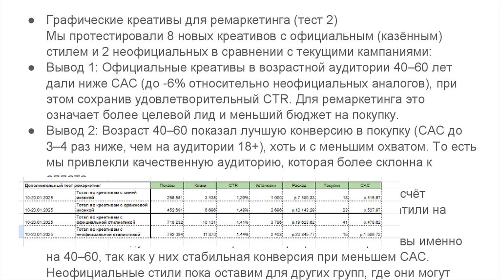 ● Вывод 1: Официальные креативы в возрастной аудитории 40–60 лет