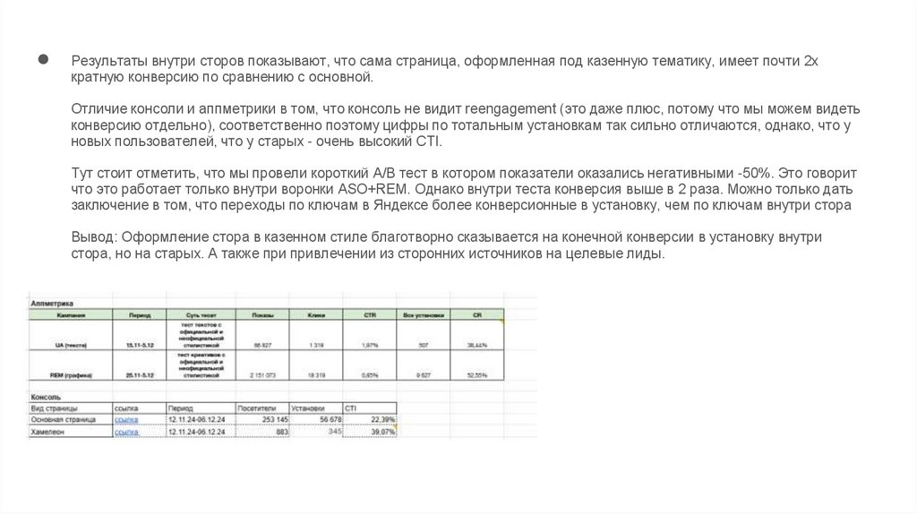 Результаты внутри сторов показывают, что сама страница, оформленная под казенную тематику, имеет почти 2х
