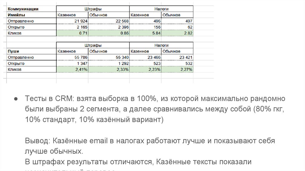 ● Тесты в CRM: взята выборка в 100%, из которой максимально рандомнобыли выбраны 2 сегмента, а далее сравнивались между собой (80% гкг,