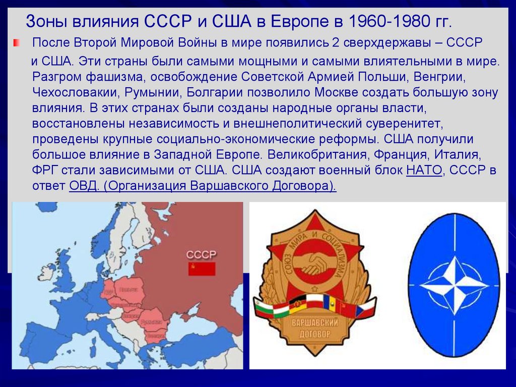 Зоны влияния СССР и США в Европе в 1960-1980 гг.После Второй Мировой Войны в мире появились 2 сверхдержавы – СССР