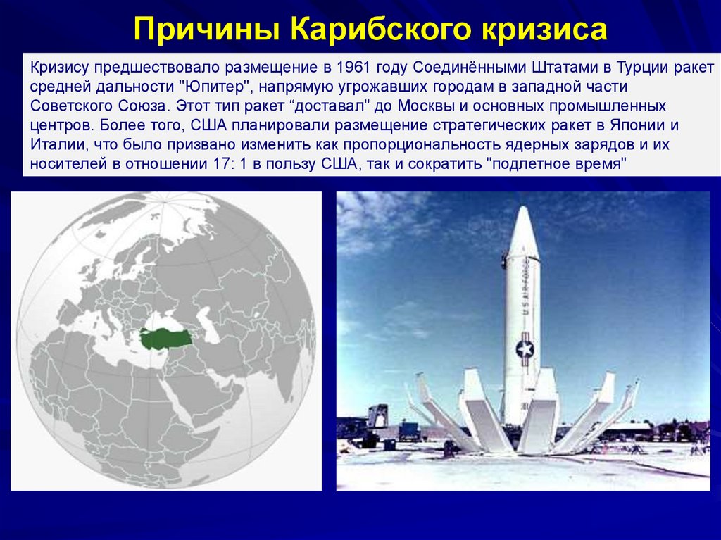 Причины Карибского кризисаКризису предшествовало размещение в 1961 году Соединёнными Штатами в Турции ракет
