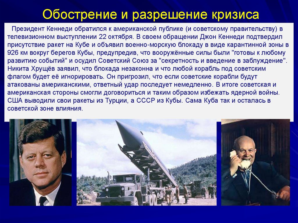 Обострение и разрешение кризисаПрезидент Кеннеди обратился к американской публике (и советскому правительству) в