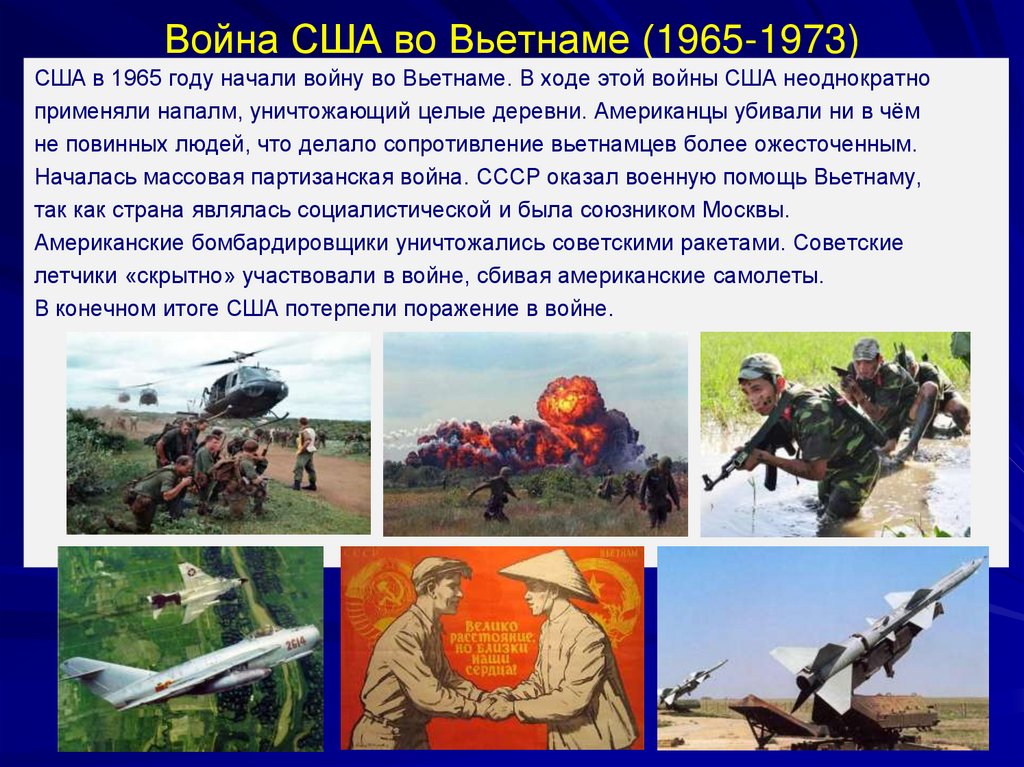 США в 1965 году начали войну во Вьетнаме. В ходе этой войны США неоднократноприменяли напалм, уничтожающий целые деревни. Американцы убивали ни в чём