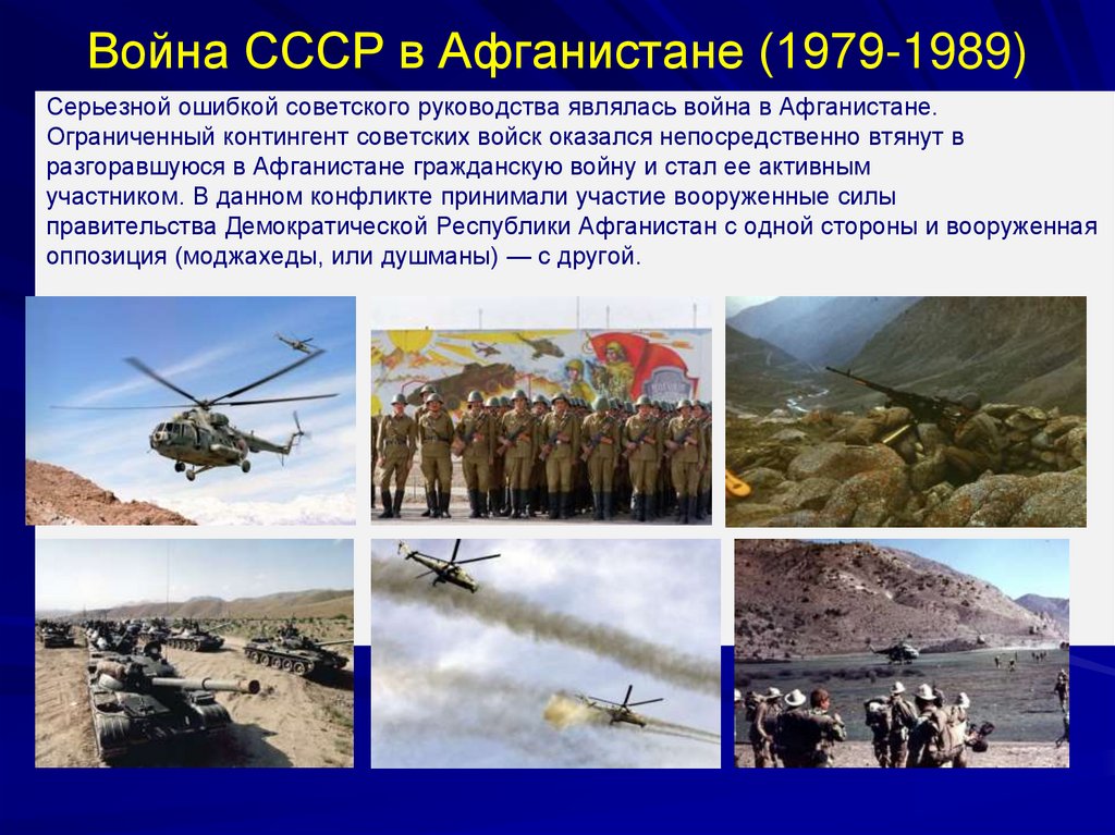 Серьезной ошибкой советского руководства являлась война в Афганистане.Ограниченный контингент советских войск оказался непосредственно втянут в