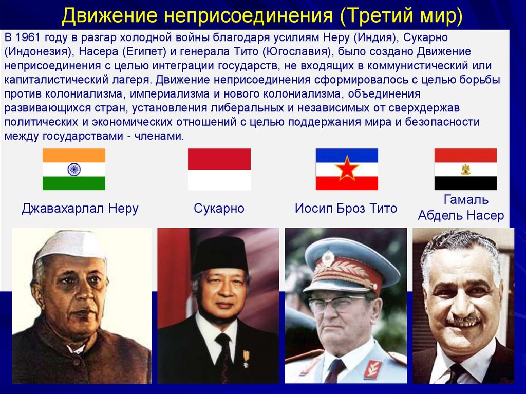 В 1961 году в разгар холодной войны благодаря усилиям Неру (Индия), Сукарно(Индонезия), Насера (Египет) и генерала Тито (Югославия), было создано Движение