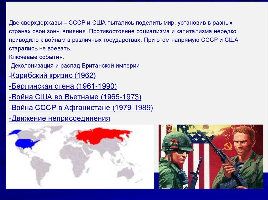 Две сверхдержавы – СССР и США пытались поделить мир, установив в разныхстранах свои зоны влияния. Противостояние социализма и капитализма нередко