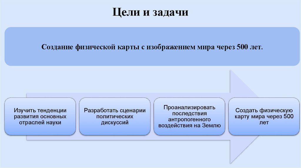 Цели и задачиСоздание физической карты с изображением мира через 500 лет.