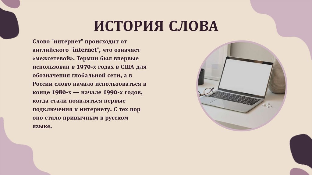ИСТОРИЯ СЛОВАСлово "интернет" происходит от