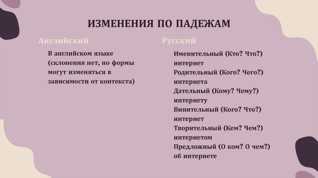 ИЗМЕНЕНИЯ ПО ПАДЕЖАМАнглийский