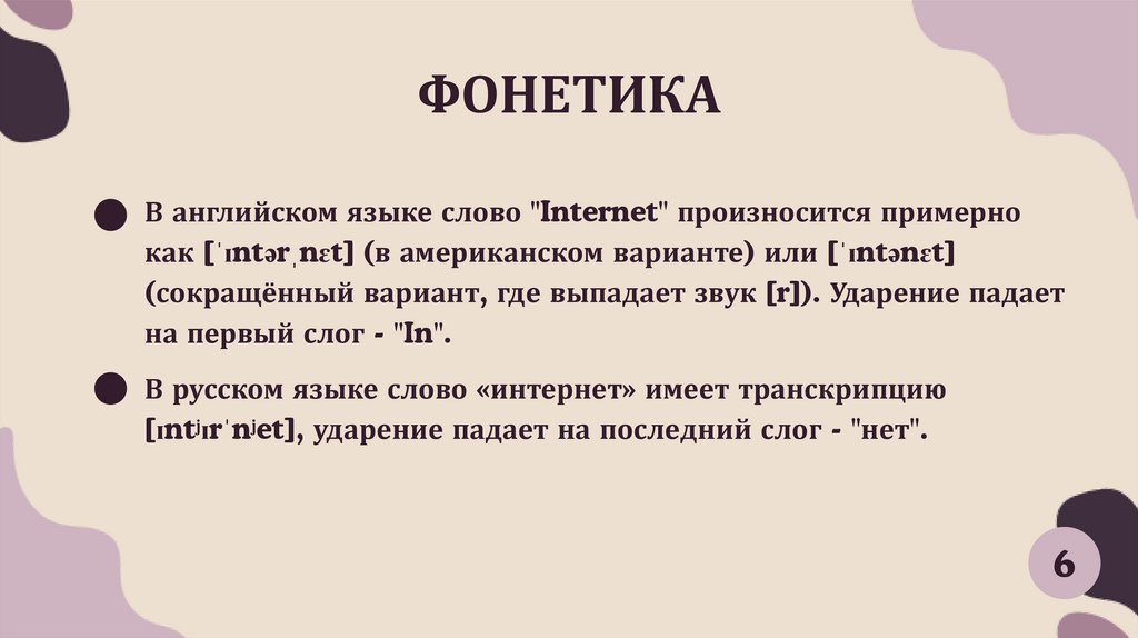 ФОНЕТИКАВ английском языке слово "Internet" произносится примерно