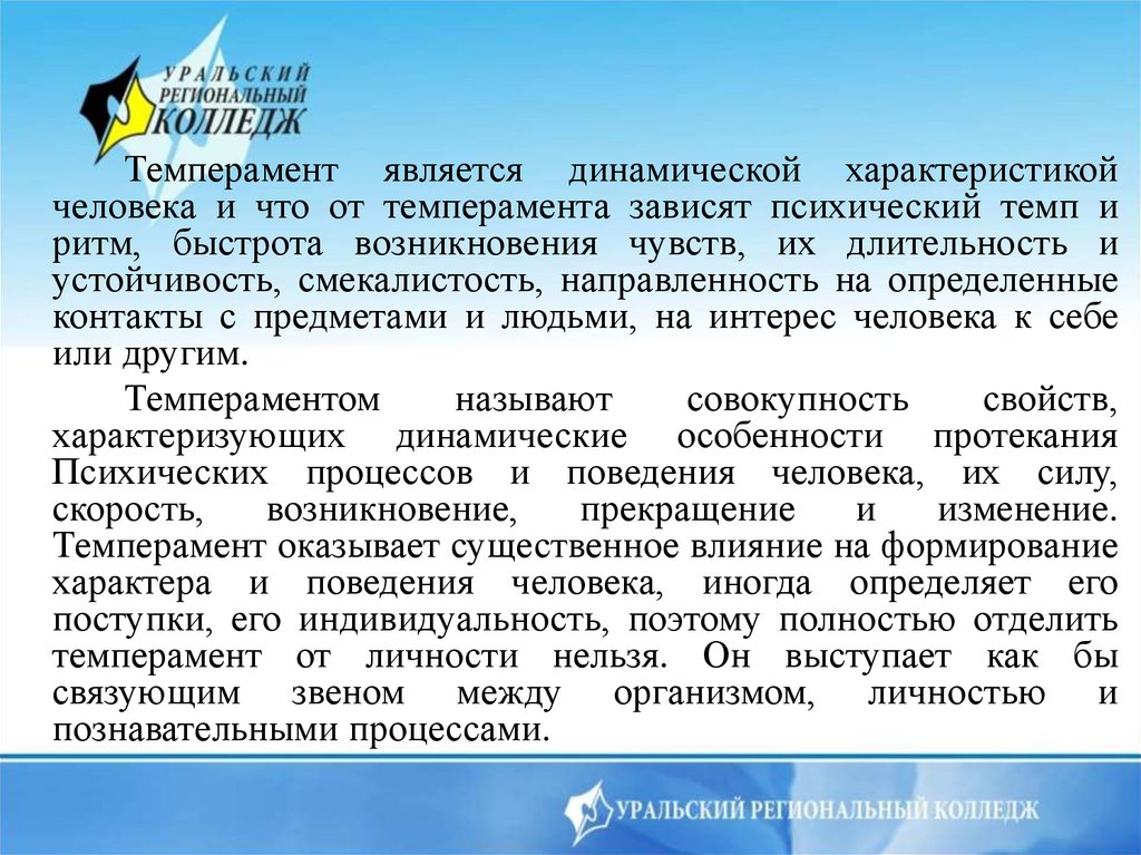 Темперамент является динамической характеристикойчеловека и что от темперамента зависят психический темп и