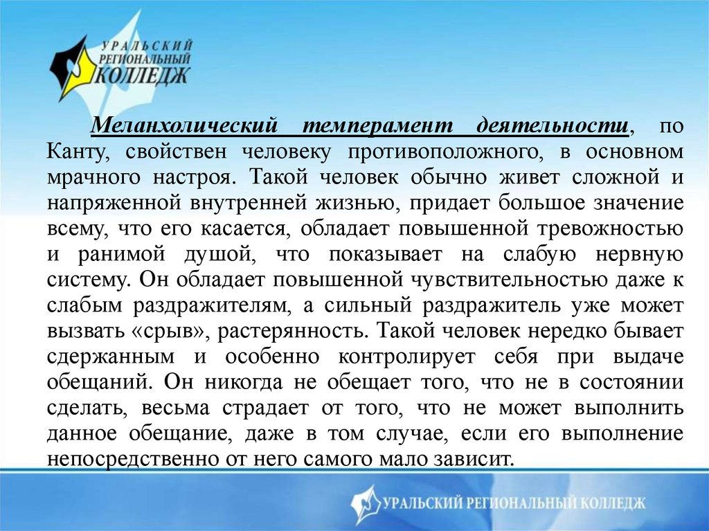 Меланхолический темперамент деятельности, поКанту, свойствен человеку противоположного, в основном