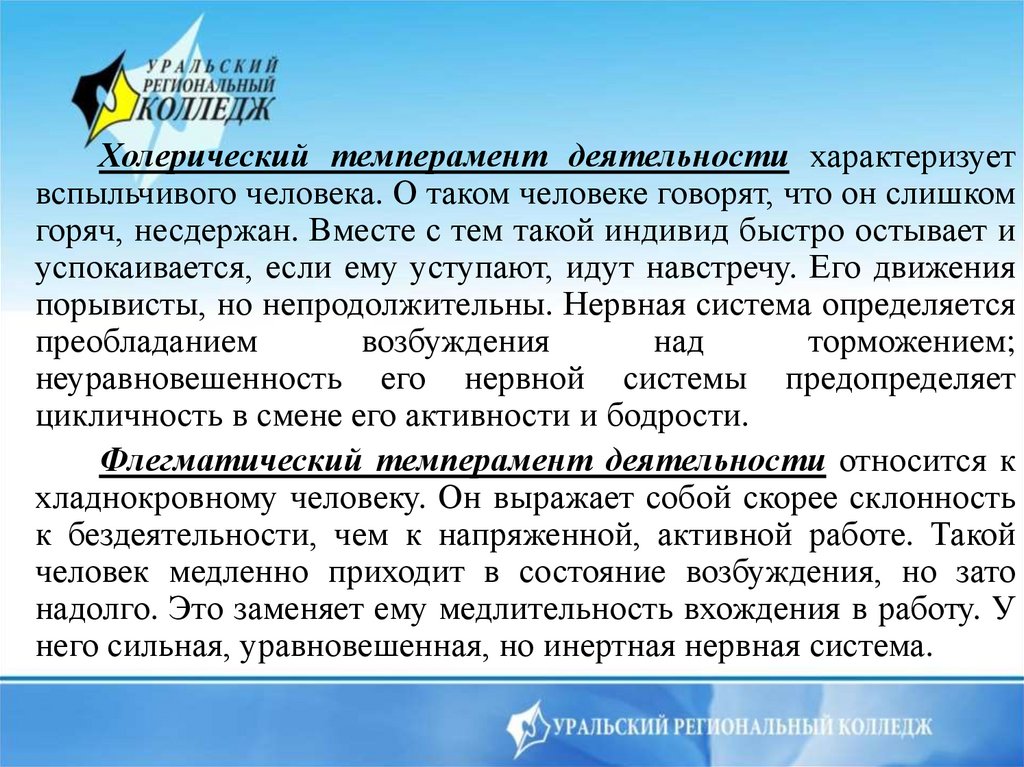 Холерический темперамент деятельности характеризуетвспыльчивого человека. О таком человеке говорят, что он слишком