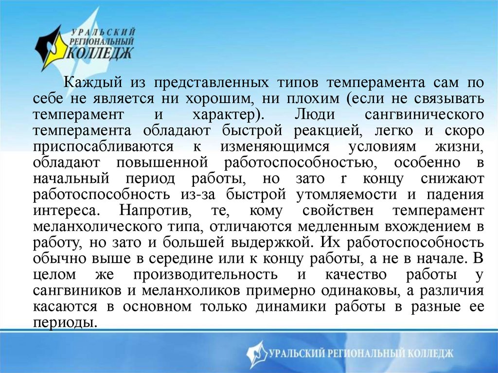 Каждый из представленных типов темперамента сам посебе не является ни хорошим, ни плохим (если не связывать