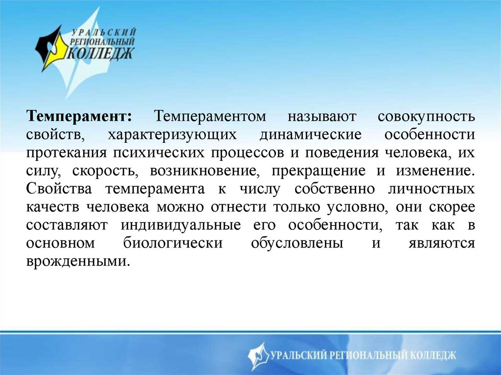 Темперамент: Темпераментом называют совокупностьсвойств, характеризующих динамические особенности