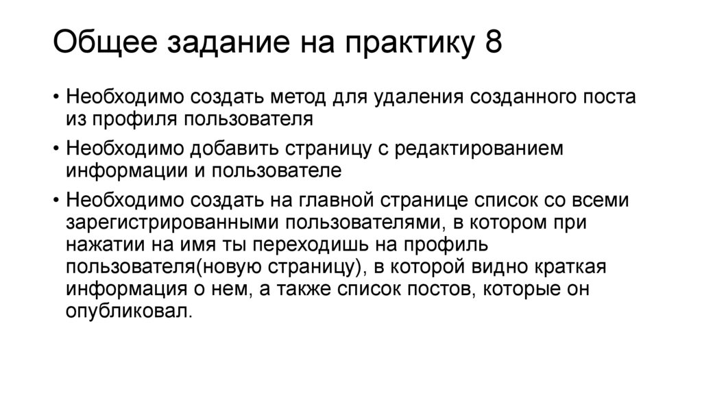 Общее задание на практику 8• Необходимо создать метод для удаления созданного поста