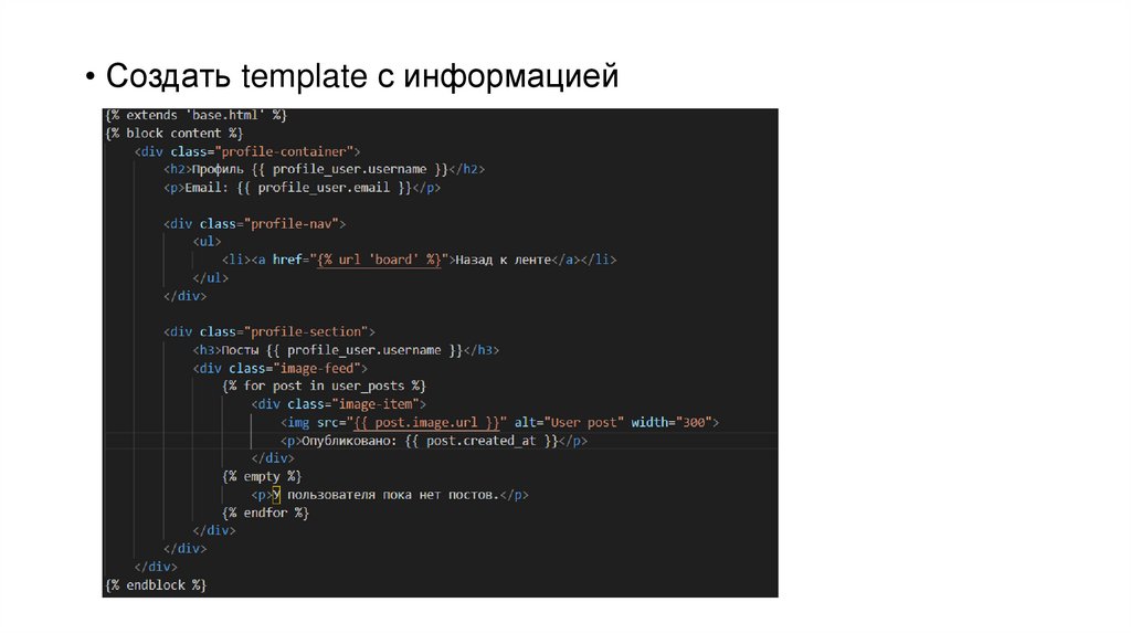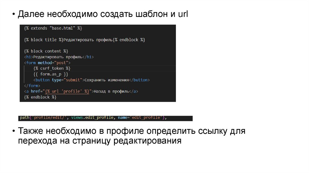 • Далее необходимо создать шаблон и url• Также необходимо в профиле определить ссылку для