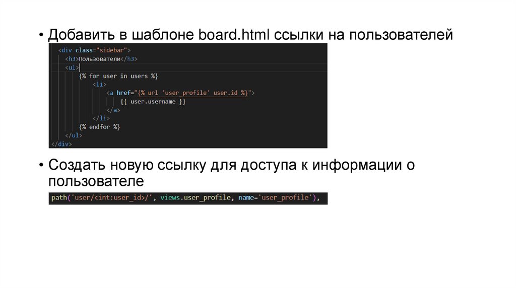 • Добавить в шаблоне board.html ссылки на пользователей• Создать новую ссылку для доступа к информации о