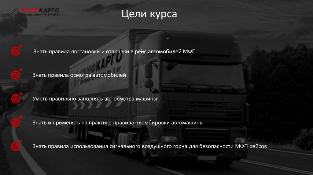 Цели курсаЗнать правила постановки и отправки в рейс автомобилей МФП