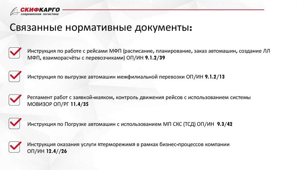 Связанные нормативные документы:Инструкция по работе с рейсами МФП (расписание, планирование, заказ автомашин, создание ЛЛ