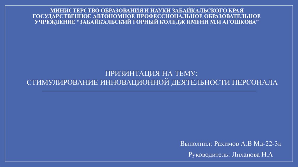 УЧРЕЖДЕНИЕ “ЗАБАЙКАЛЬСКИЙ ГОРНЫЙ КОЛЕДЖ ИМЕНИ М.И АГОШКОВА”