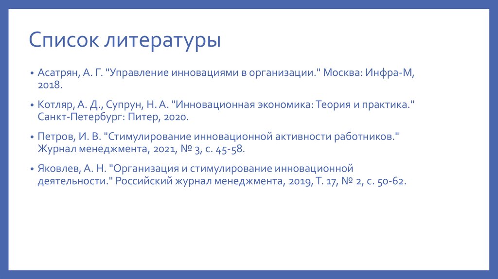Список литературы• Асатрян, А. Г. "Управление инновациями в организации." Москва: Инфра-М,