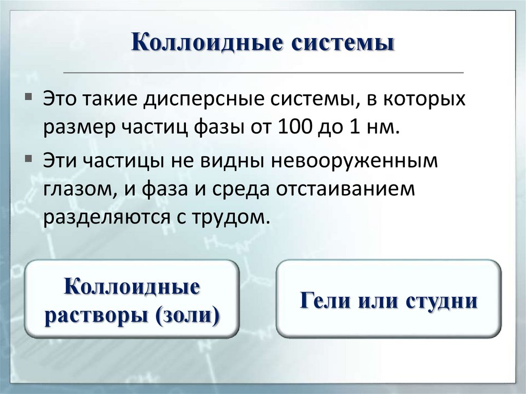 Это такие дисперсные системы, в которыхразмер частиц фазы от 100 до 1 нм.