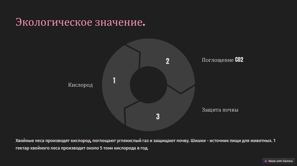 Хвойные леса производят кислород, поглощают углекислый газ и защищают почву. Шишки - источник пищи для животных. 1