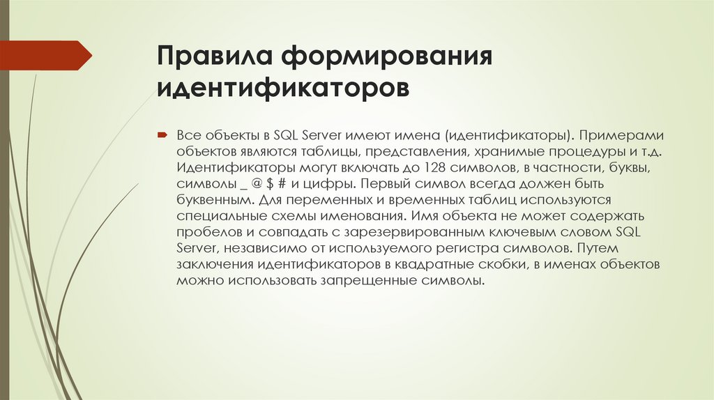 Все объекты в SQL Server имеют имена (идентификаторы). Примерами