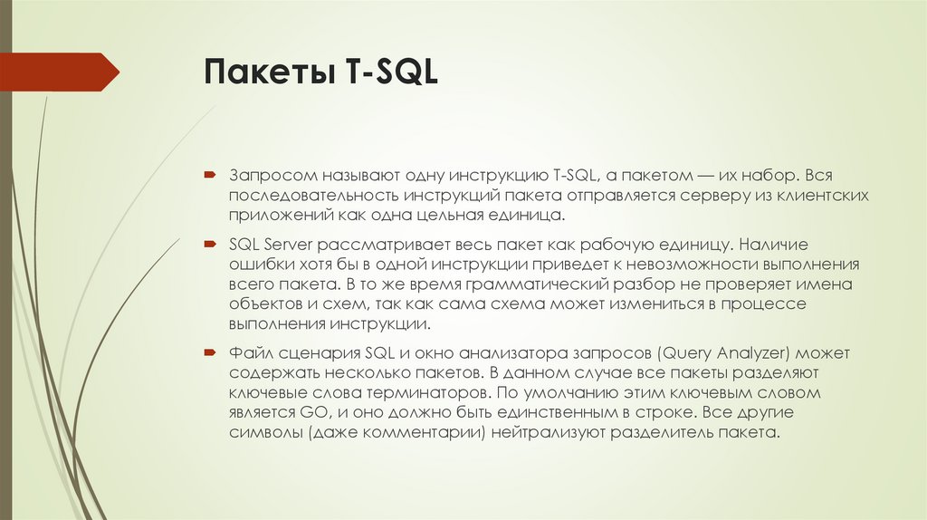 Пакеты T-SQLЗапросом называют одну инструкцию T-SQL, а пакетом — их набор. Вся