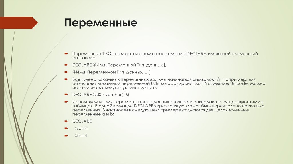 ПеременныеПеременные T-SQL создаются с помощью команды DECLARE, имеющей следующий