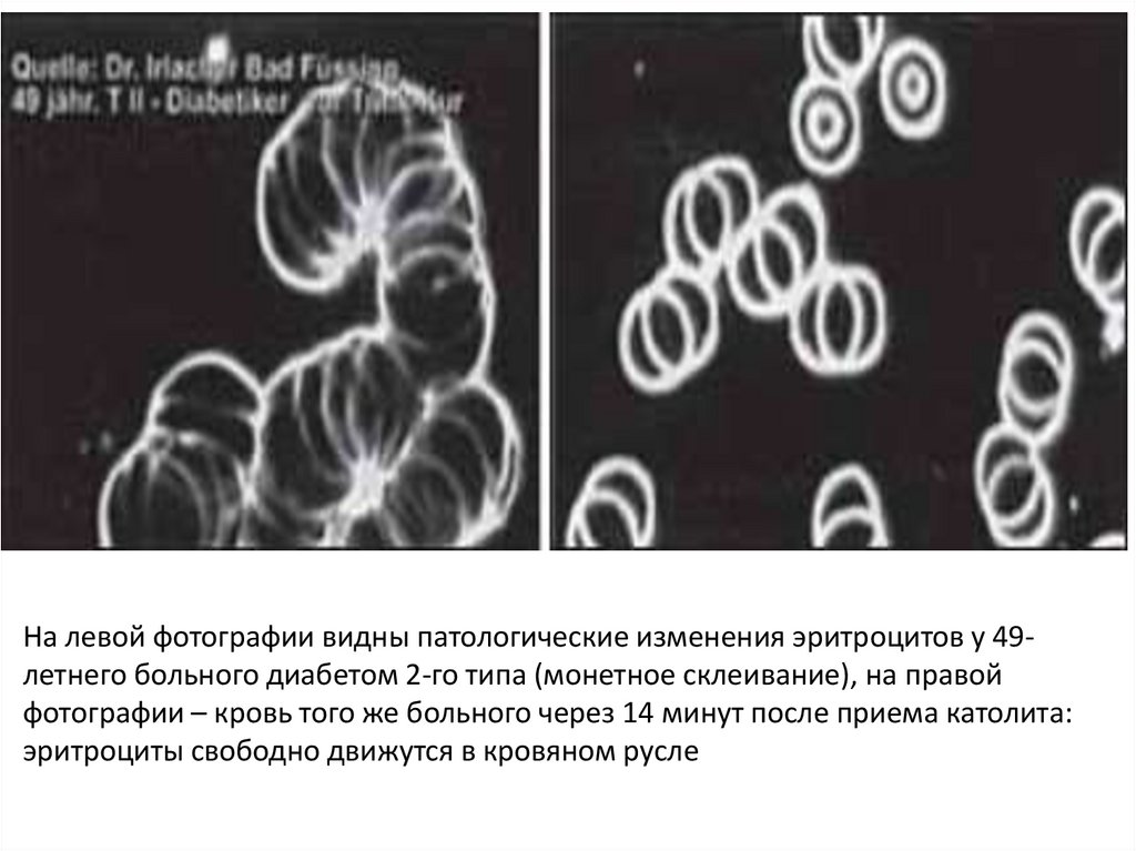 На левой фотографии видны патологические изменения эритроцитов у 49летнего больного диабетом 2-го типа (монетное склеивание), на правойфотографии – кровь того же больного через 14 минут после приема католита: