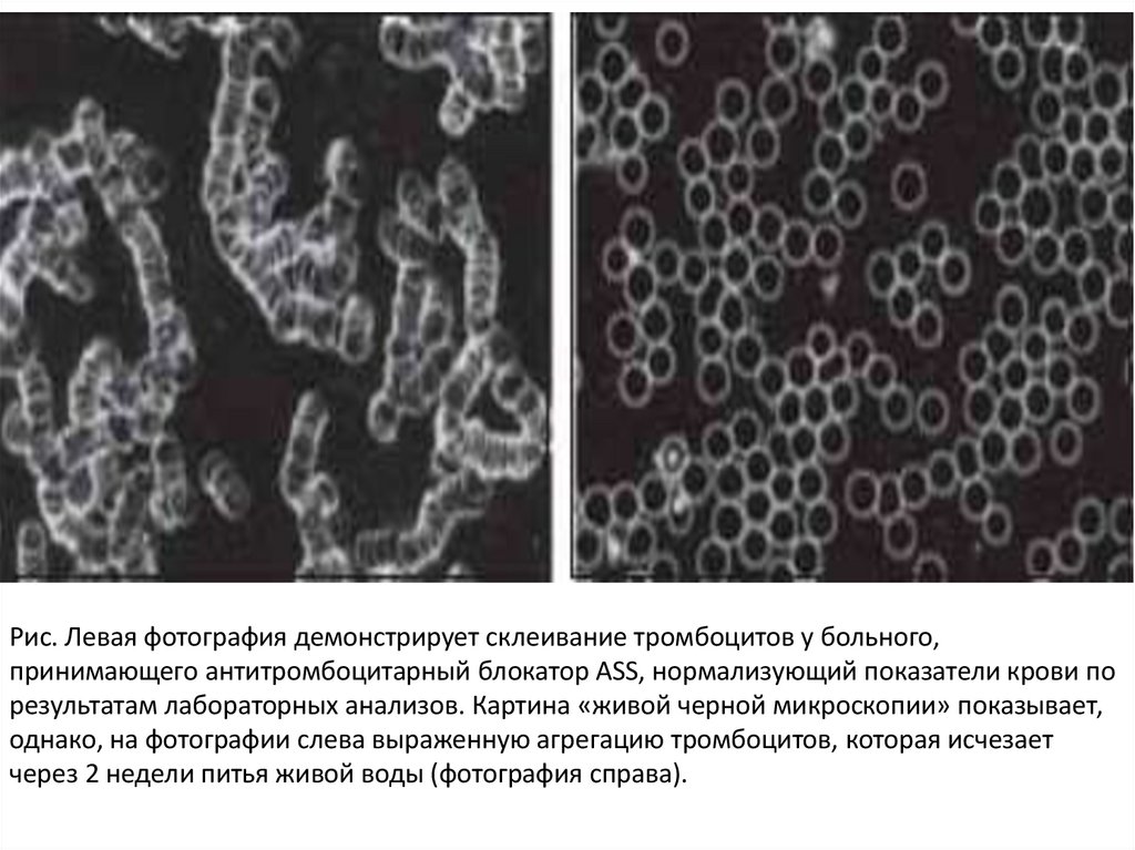 Рис. Левая фотография демонстрирует склеивание тромбоцитов у больного,принимающего антитромбоцитарный блокатор ASS, нормализующий показатели крови по