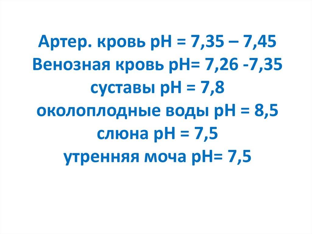 Артер. кровь рН = 7,35 – 7,45Венозная кровь рН= 7,26 -7,35