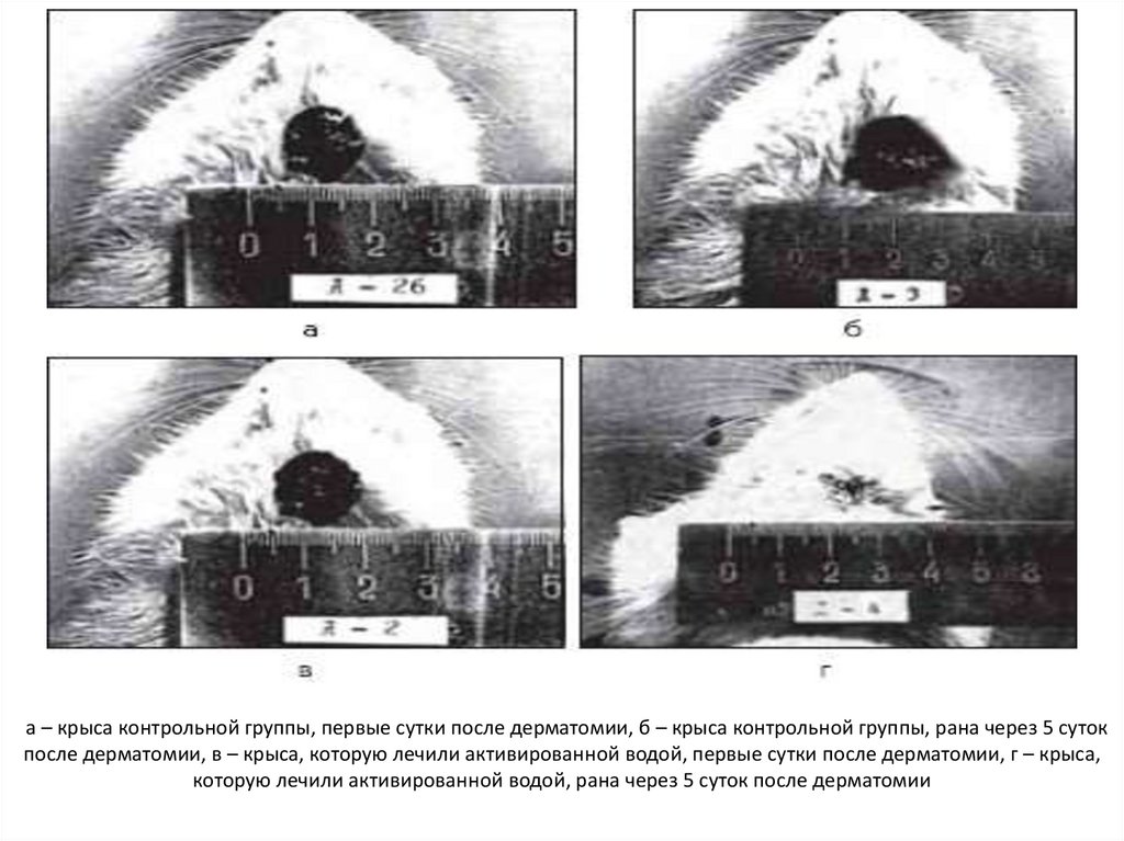 а – крыса контрольной группы, первые сутки после дерматомии, б – крыса контрольной группы, рана через 5 сутокпосле дерматомии, в – крыса, которую лечили активированной водой, первые сутки после дерматомии, г – крыса,